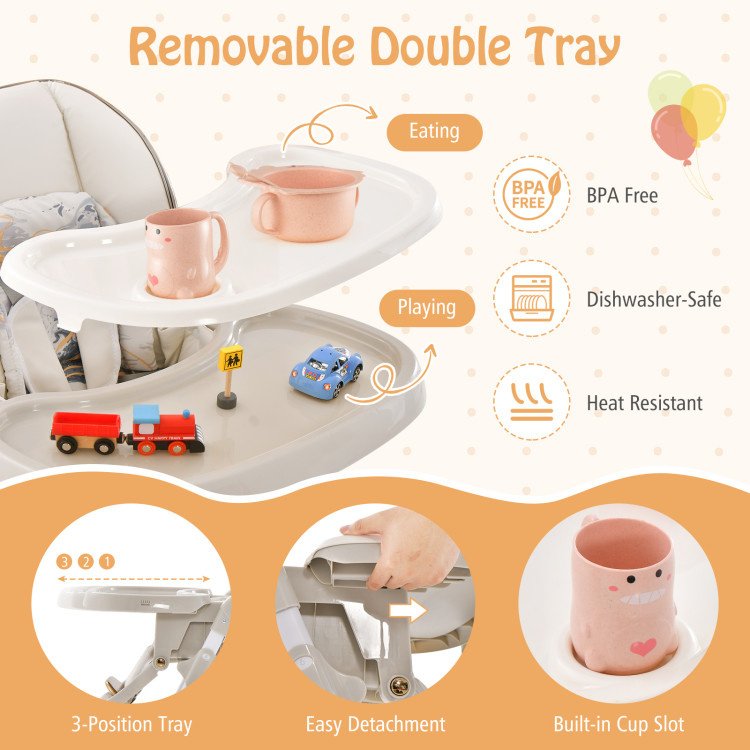 -With adjustable features like 6 seat heights, 3-level backrest, 3-gear footrest, and removable double trays, your baby can sit comfortably and more enjoy meals. Crafted with durable PP and heavy-duty metal, this high chair ensures maximum safety and stability for your child. Cleaning up is a breeze with the dishwasher-safe removable tray and the smooth, waterproof PU seat that can be easily wiped clean. In addition, the 360° wheels allow you to effortlessly move the chair from room to room, and once it's time for meal, you can lock the wheels in place. The high chair is also portable and convenient for storage or outdoor use as it can be easily folded with just one click. Choose the multifunctional baby chair for the ultimate combination of functionality, safety, and convenience.