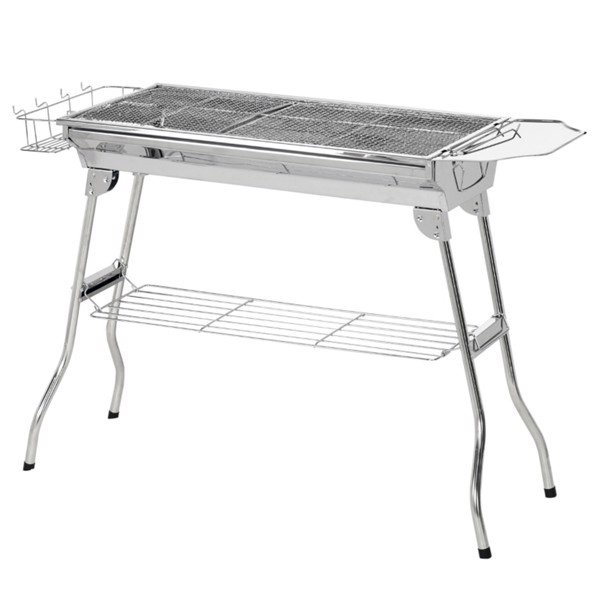 • - Portable charcoal BBQ grill with foldable legs for easy transport and storage